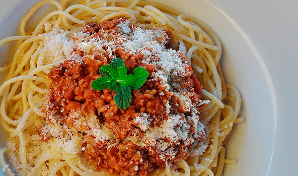 Delicioso espagueti a la Boloñesa, acompañado con su delicioso pan de ajo.